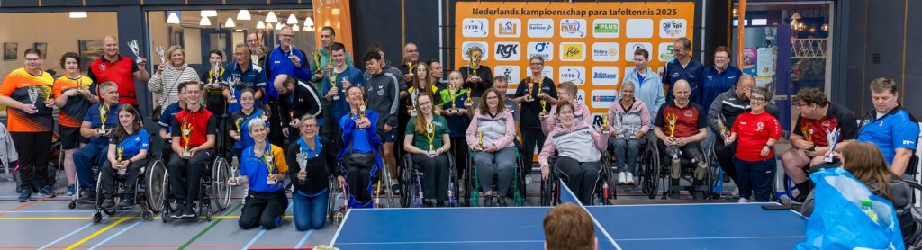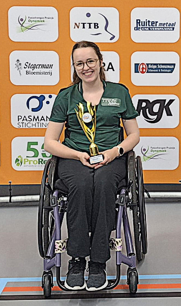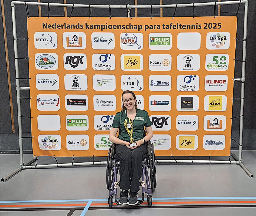 De prestatie van Ciska mag een topprestatie worden genoemd: in januari 2024 begon ze met tafeltennissen, toen nog staand, en pas in oktober 2024 trainde ze – na een pauze van een halfjaar – voor het eerst in een rolstoel. En sindsdien ging het hard: in februari speelde ze haar allereerste para-toernooi en anderhalve week geleden won ze voor het eerst een nationaal ranglijsttoernooi. Ze begon zodoende als één van de kanshebbers aan het Nederlands kampioenschap, waar ze al haar wedstrijden in het enkelspel wist te winnen, waarna ze een prachtige trofee én de titel ‘Nederlands kampioen’ in ontvangst mocht nemen.